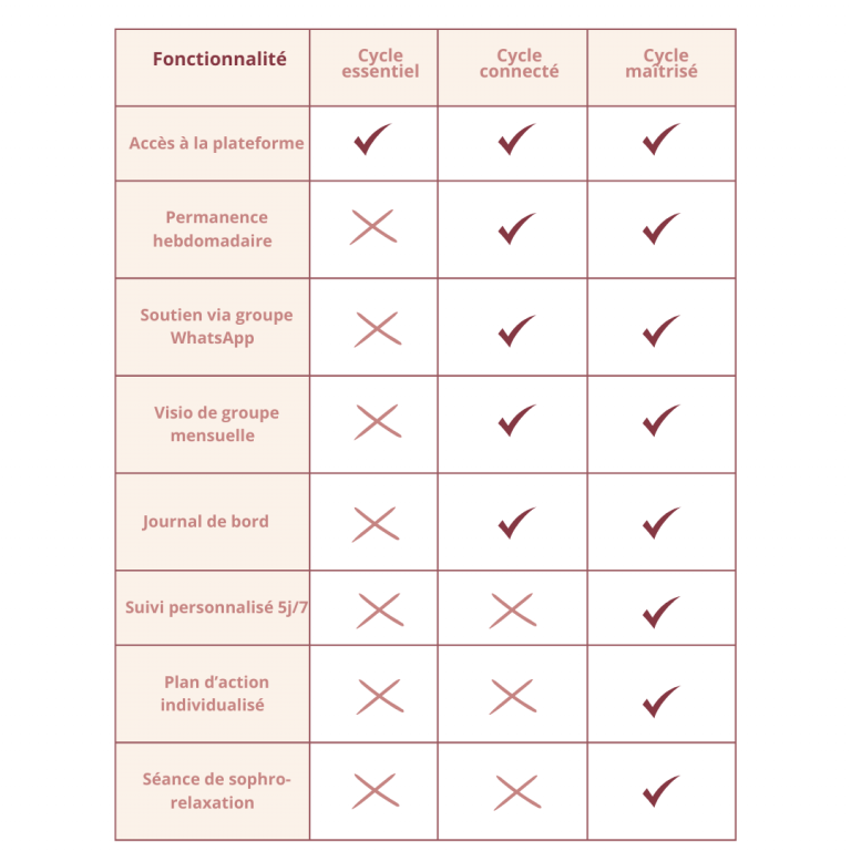 • Accès illimité à vie : Une fois inscrite, tu conserves l’accès à tous les modules et ressources de la plateforme sans limite de temps. Tu peux revenir aux contenus à chaque nouvelle phase de ton cycle ou dès que tu en ressens le besoin.
